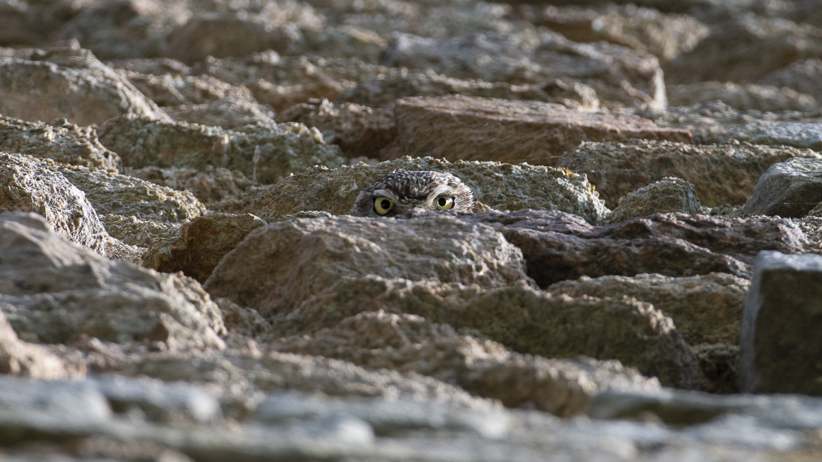 La Chevêche d’Athena est une petite chouette au plumage brun constellé de points blancs. De près, on distingue un masque blanc autour de ses yeux dorés. Son vol, ondulant, rappelle celui des pics.